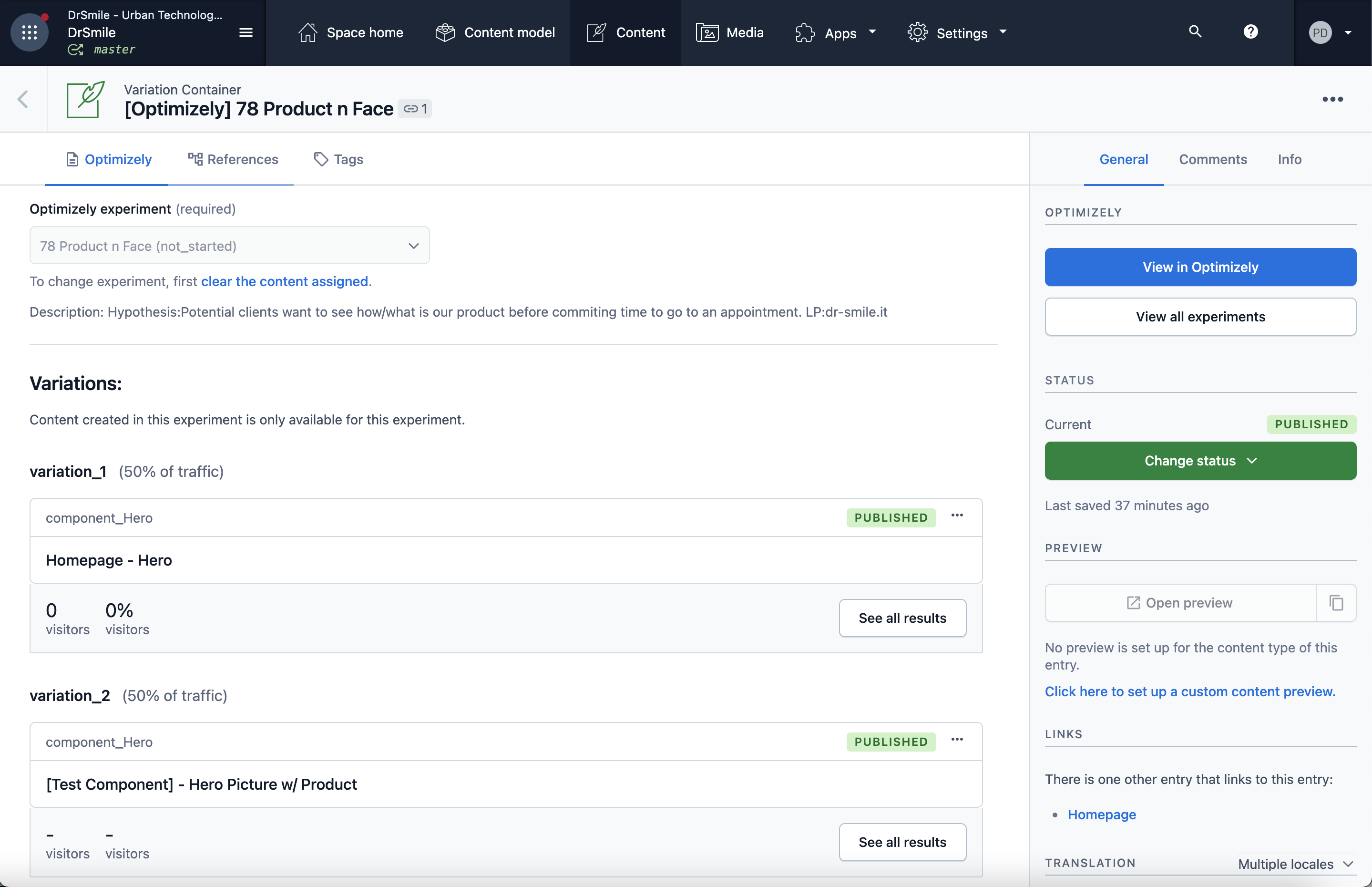 Now comes the time to improve the Editor Experience. Here's what we're working with: DrSmile uses Contentful as their headless CMS, and Optimizely has a plugin that connects to Contentful.