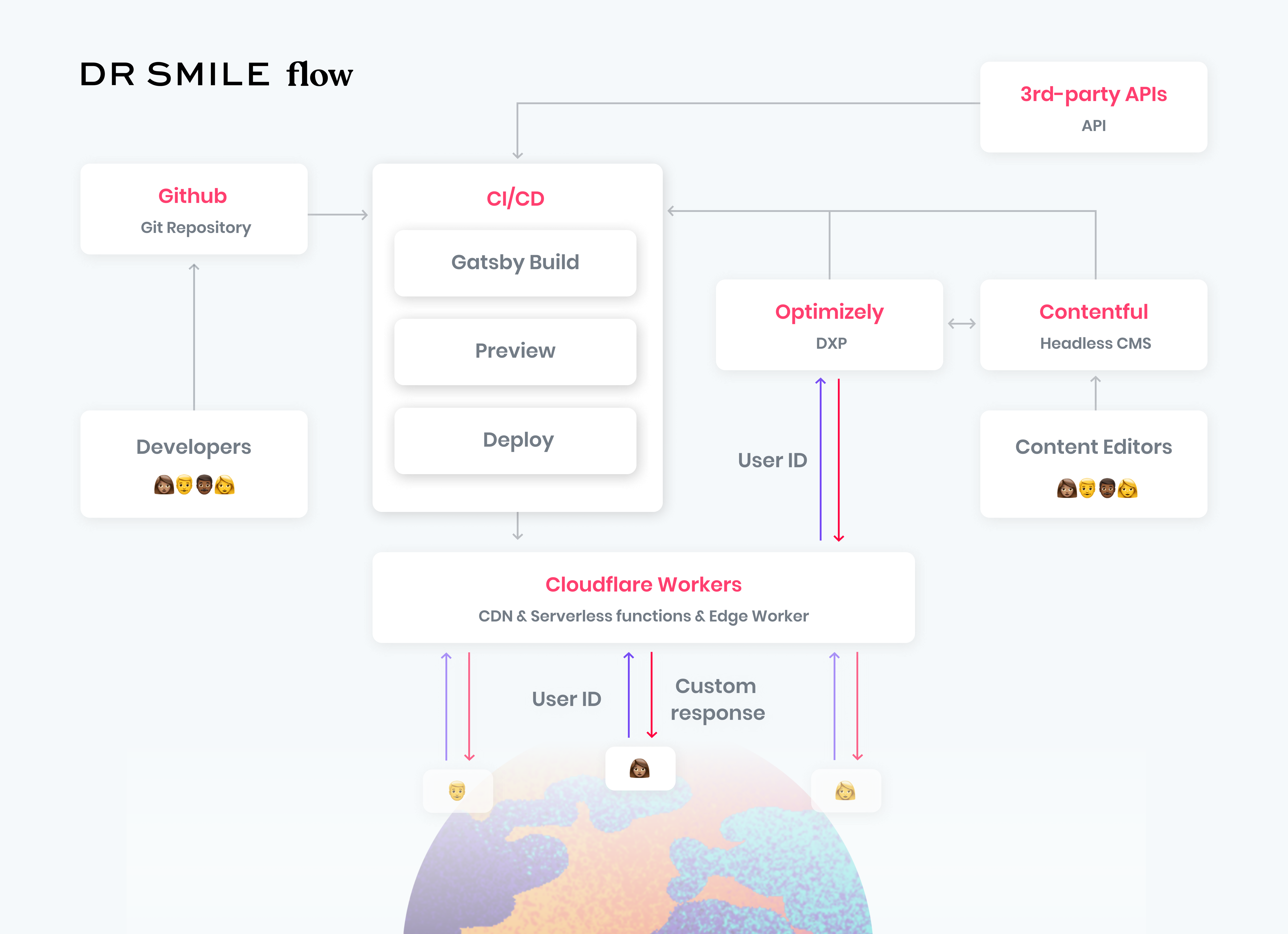 For DrSmile, we decided to use Cloudflare Workers to modify the HTML response and serve each user a different variant of an experiment. This response is based on an anonymous user ID that we generate at the edge and save in cookies.