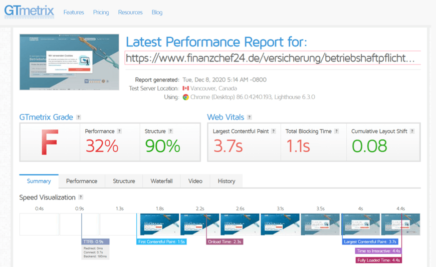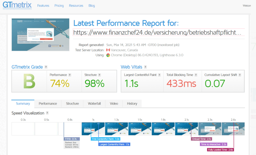Here’s a glimpse of the web vitals metrics of one of their main pages – the one for business liability insurance: https://www.finanzchef24.de/versicherung/betriebshaftpflichtversicherung.