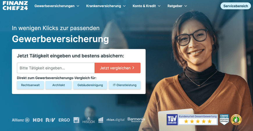 Founded in 2012, Finanzchef24 is Germany’s largest digital insurance broker. They work with 46 reputable partners, including Allianz, ARAG, and ERGO — and provide a risk analysis comparison to help entrepreneurs or self-employed individuals to acquire insurance to cover business or professional liability, property damage, industrial property, as well as cyber or business content.