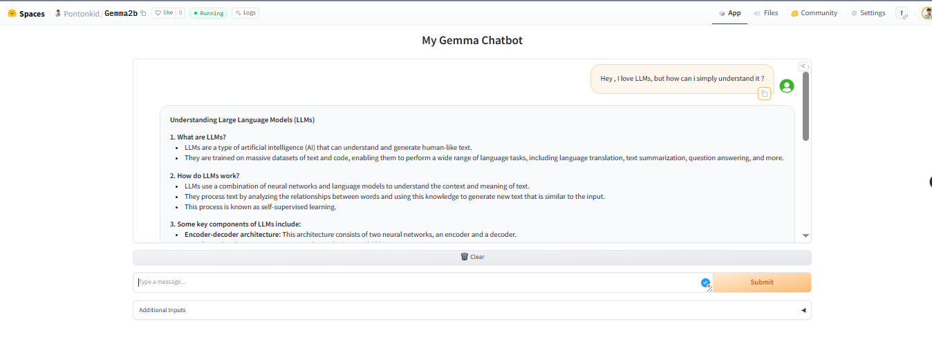 Voila! Well done, you have just built your own chatbot with Gemma.