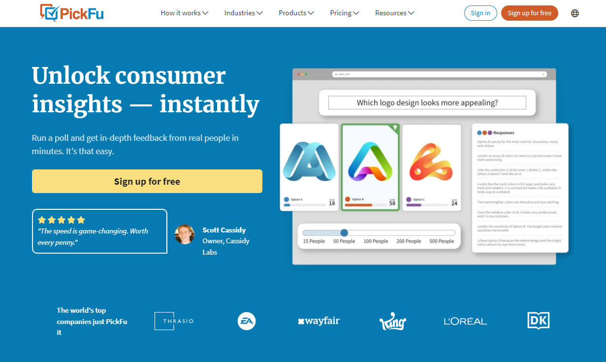 PickFu is a do-it-yourself online consumer research platform that instantly connects you to real people giving honest opinions. PickFu is a San Francisco-based company launched in 2008 that provides a polling platform for businesses. It was founded by Justin Chen and John Li, who were working on another venture at the time. They built PickFu as a way to quickly and informatively break ties when they disagreed. The platform was initially not a main focus for the co-founders, but as people discovered it and shared it with others, it gained popularity and they realized its potential. Since then, PickFu has grown to serve thousands of customers across various industries and has received over 3 million responses to various aspects of product development.PickFu lets you make data-driven decisions within minutes instead of days.
