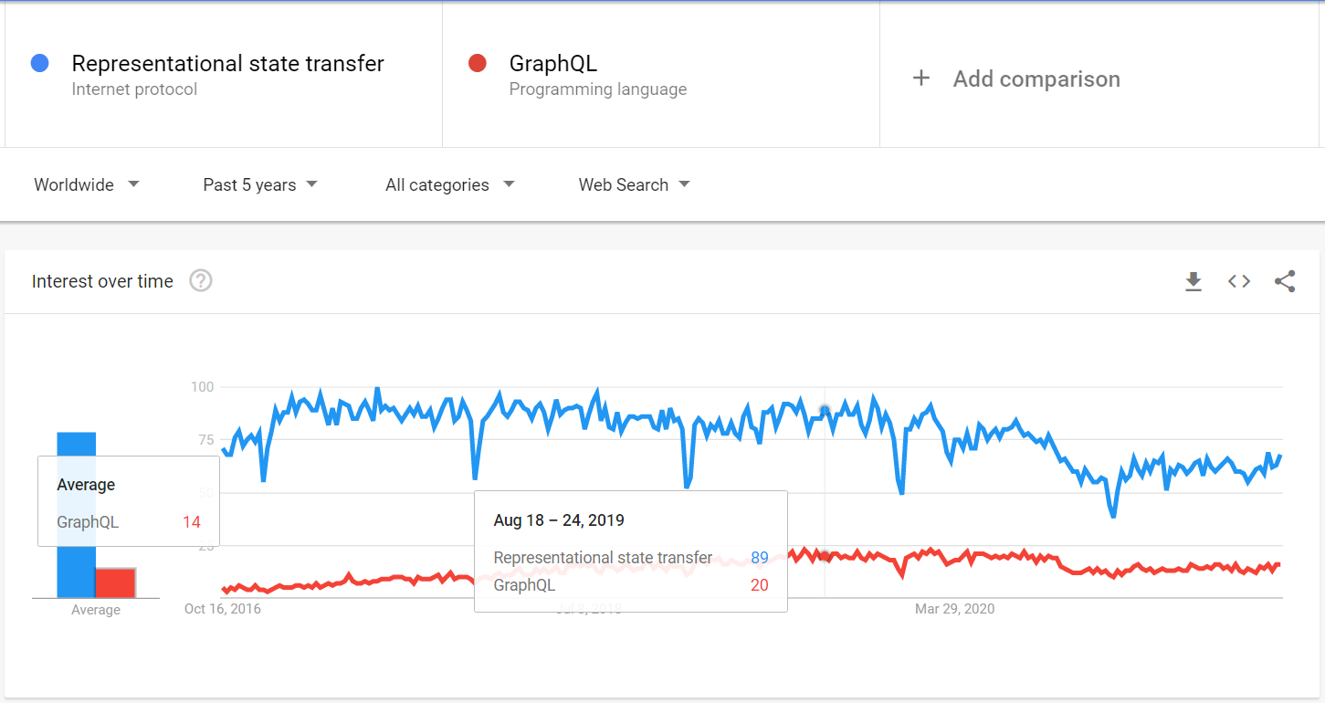- Popularity: A dominant API infrastructure in the market between 2011-2015, REST still stands out as the most widely used architectural style for web services due to its rich ecosystem. According to Google Trends, you can see that REST continues to be a popular architectural style for API design compared to GraphQL.