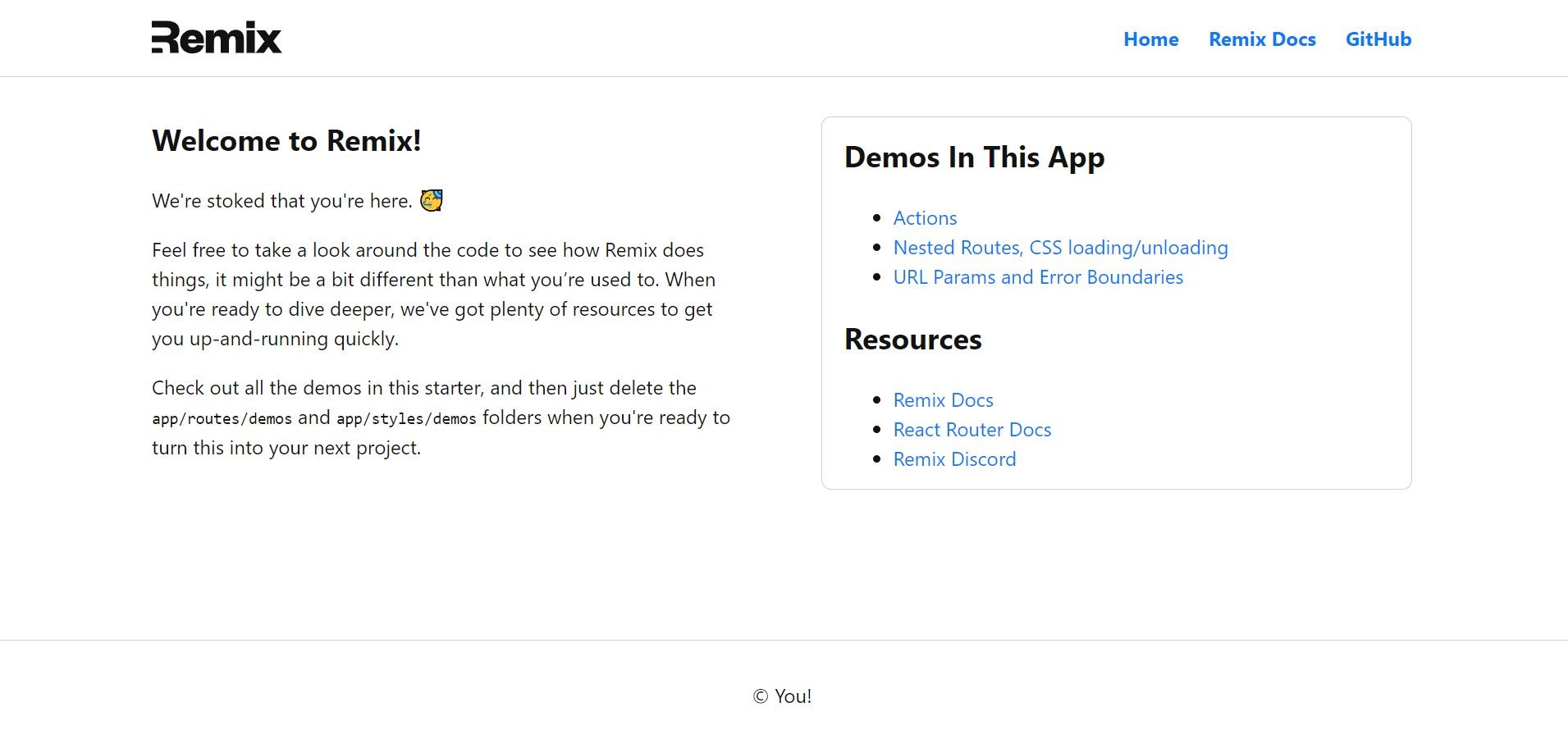 Finally, you're asked if you wish to run npm install, which obviously is a yes - to automatically have all the required dependencies installed for us. After the installation is complete, we are presented with a scaffolded remix demo app.