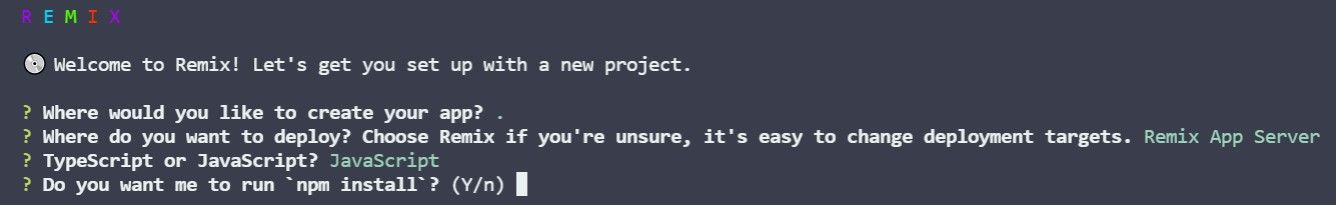 npx create-remix@latestAfter that, you are presented with an interactive welcome screen, prompting you to determine what should be included in the boilerplate demo app.
