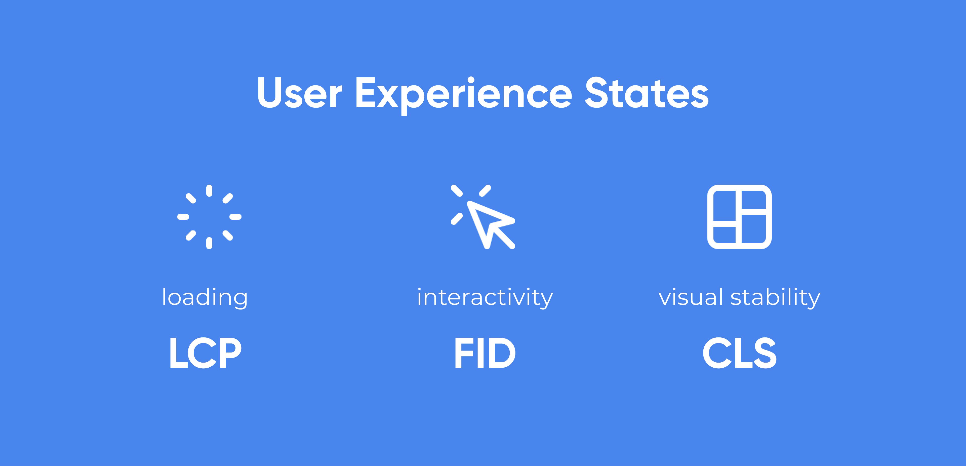 User Experience states by metric: loading (LCP), interactivity (FID) and visual stability (CLS).