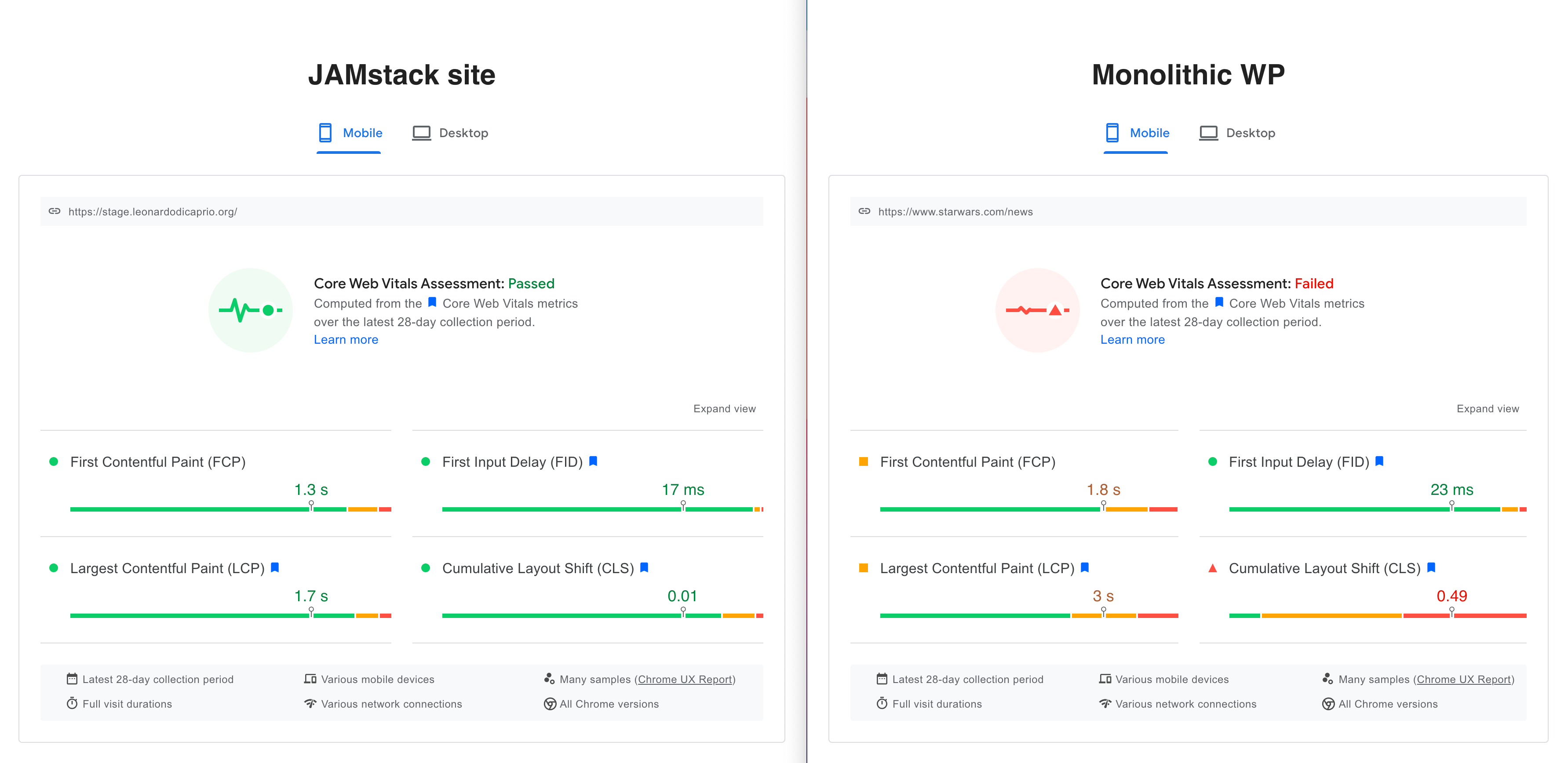 Jamstack site vs Monolithic WP Web performance assessment — PageSpeed Insights