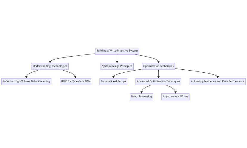 This diagram illustrates building a write-intensive system, emphasizing Kafka's data streaming and tRPC's type-safe APIs. It showcases foundational setups, optimization techniques, and the importance of resilience and peak performance.