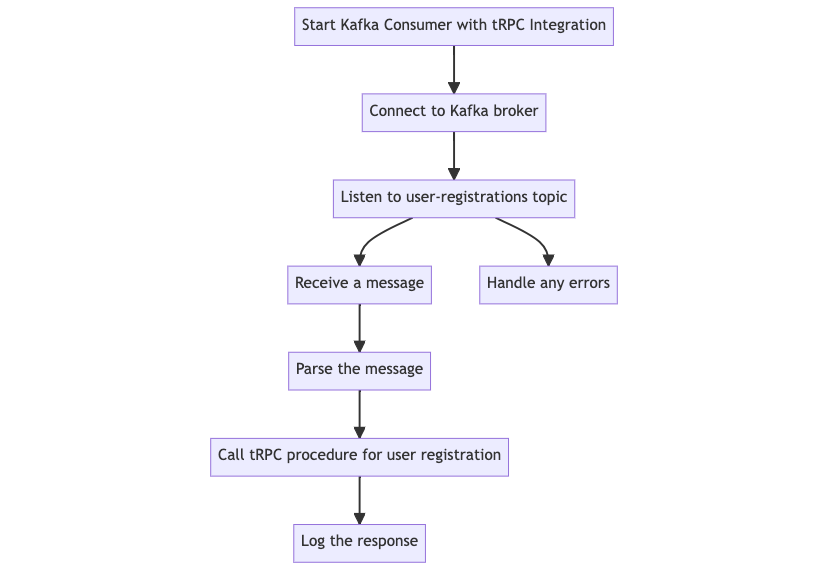 zod. This ensures type safety.registerUser mutation will be called when we receive an event from Kafka.With the tRPC procedure in place, the next step is to trigger it when a Kafka consumer reads a user registration event. The following diagram provides a step-by-step flow of how the Kafka consumer integrates with tRPC to handle user registration events.