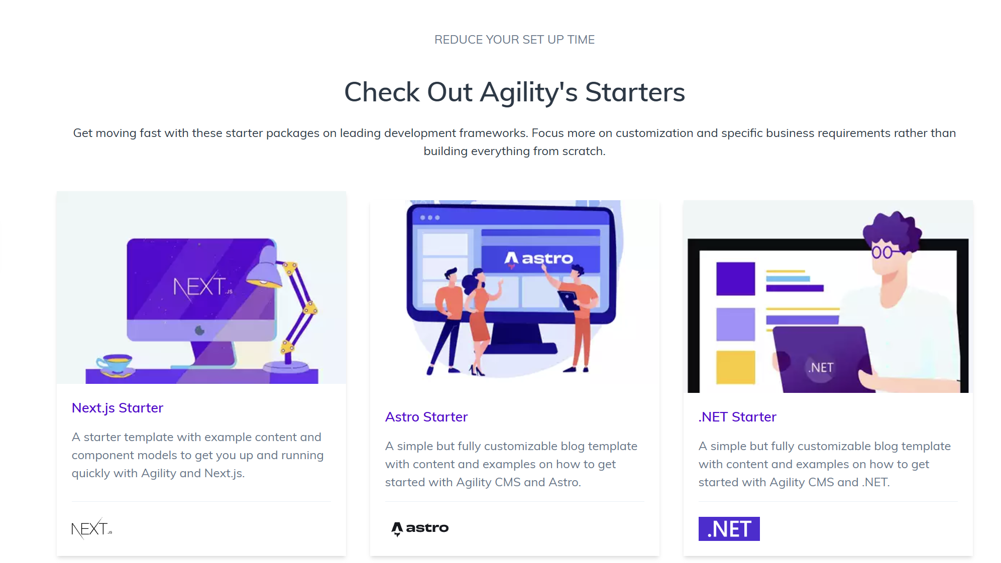 When you sign up Agility welcomes you with a quick starters screen. You can pick Next.js, Astro, Nuxt, Eleventy, and more, or start with a blank instance that you can customize yourself.