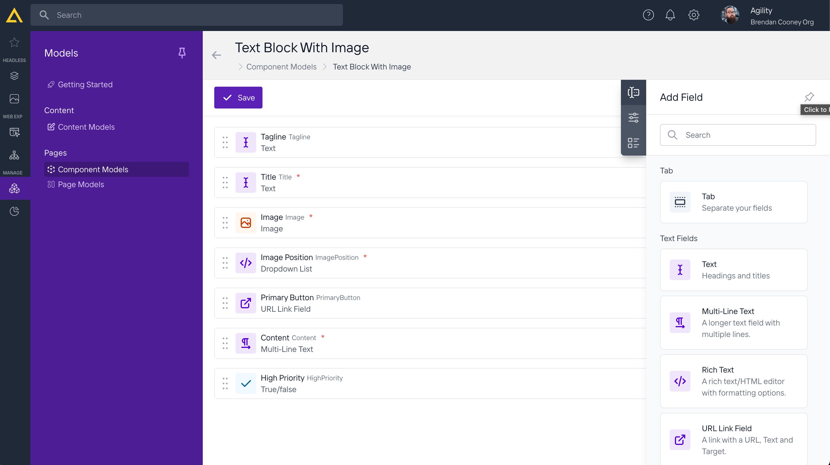 Agility offers a pretty advanced field configurator. You can choose from standard text fields to references and custom fields like color picker or video.