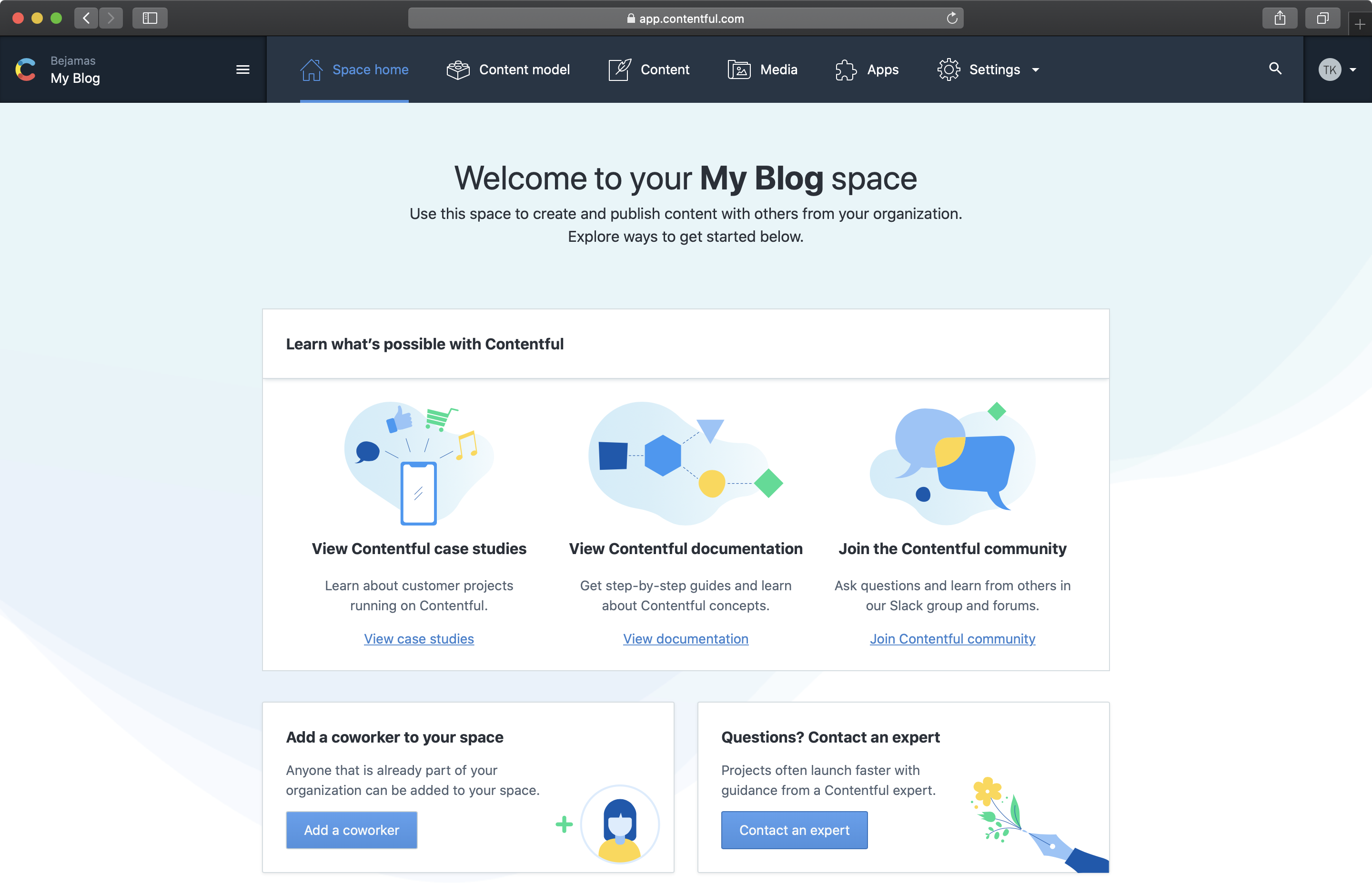 When creating a new project you are presented with the welcome screen, the home tab for your new Contentful Space. A space contains everything you need to create and manage your content. There are some helpful links to learning more about Contentful including their documentation.
