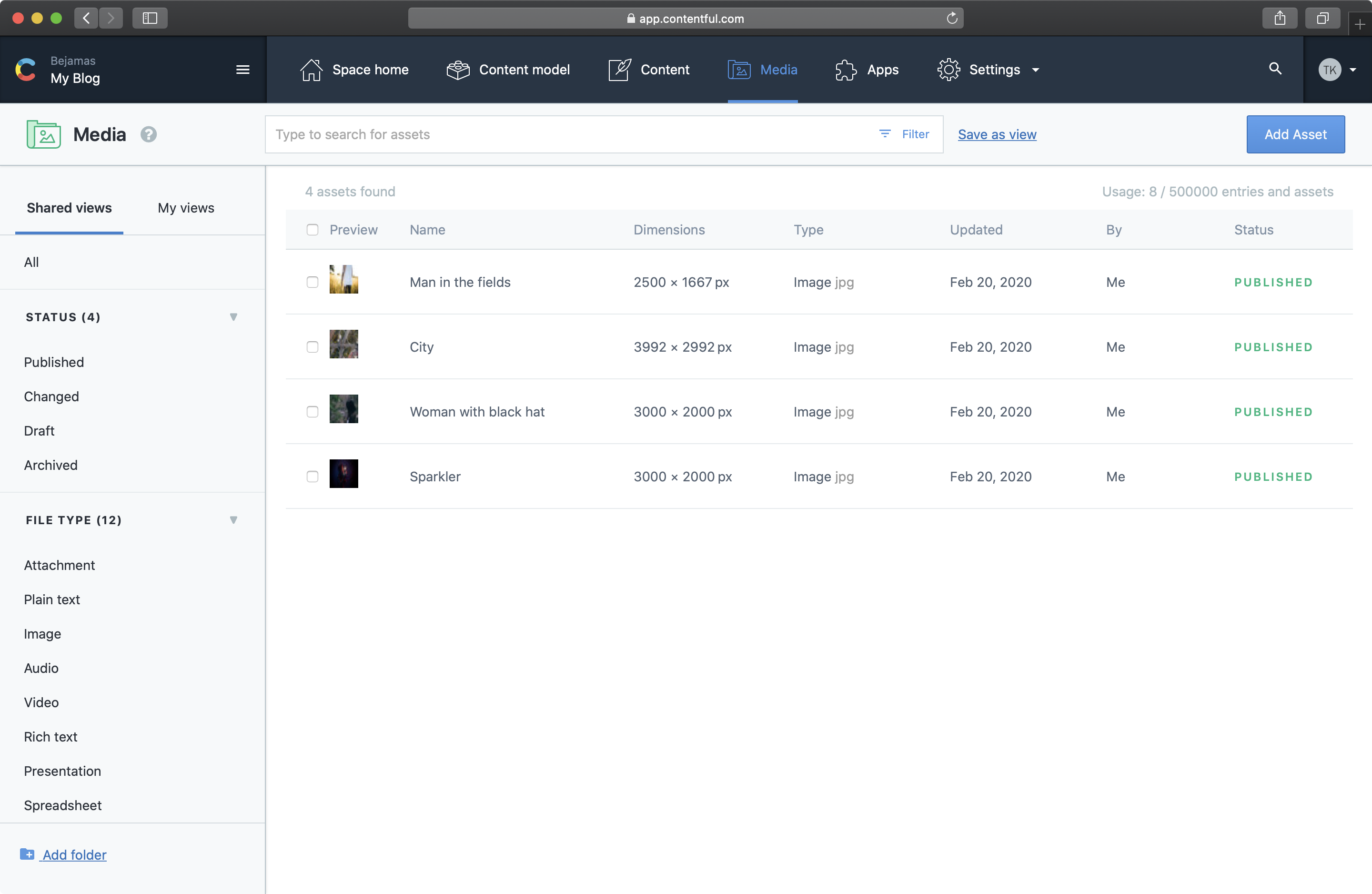 Next, we have the content tab. This is where you create and manage your content entries including linking to media you’ve uploaded. Contentful allows for pretty much every popular file format including image, video, audio, pdf, spreadsheet, etc.