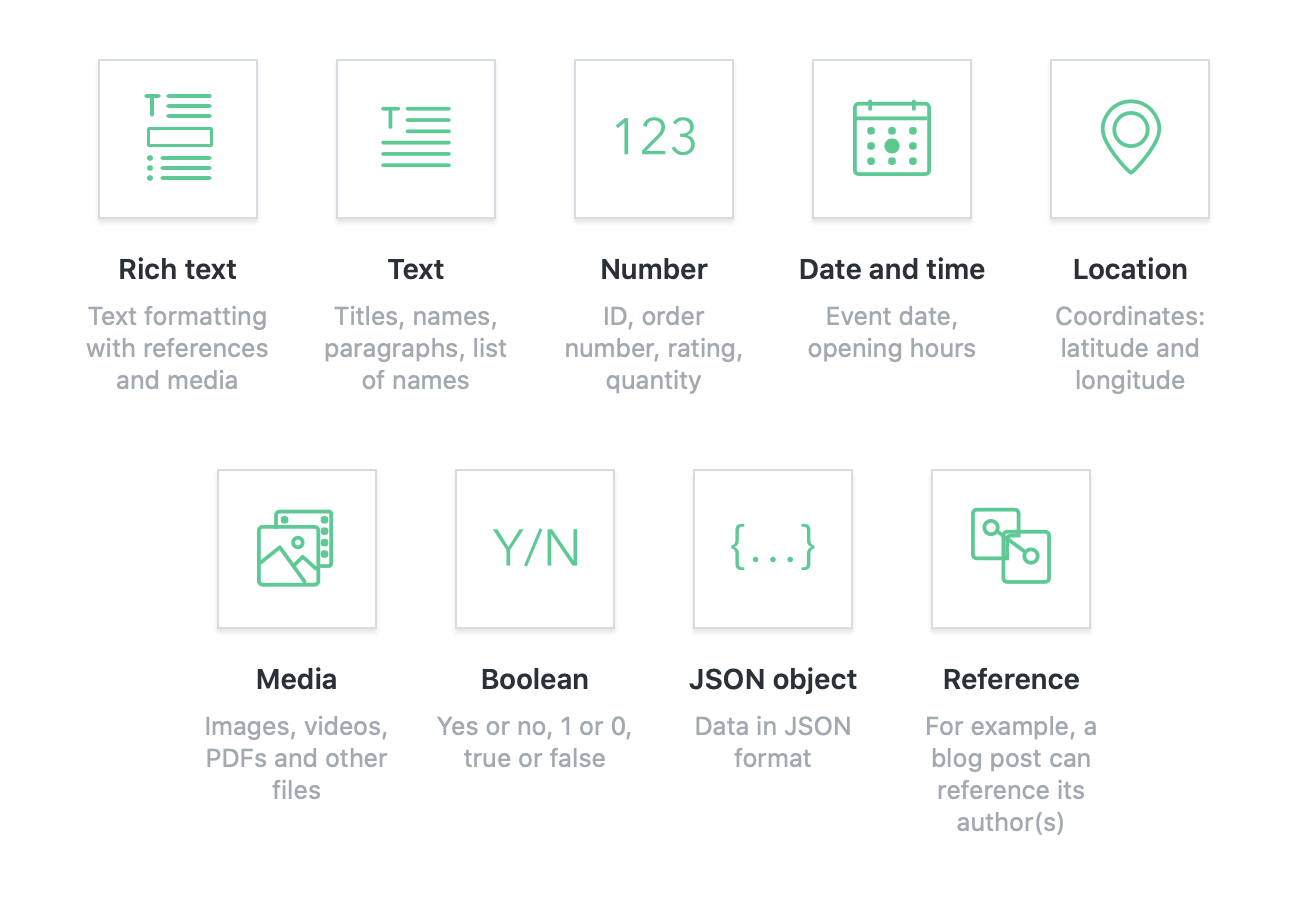 I strongly recommend that you create a free personal account and take a look at all the available options you have with these fields. It will soon become clear why so much planning needs to be done when creating your content model for the first time.