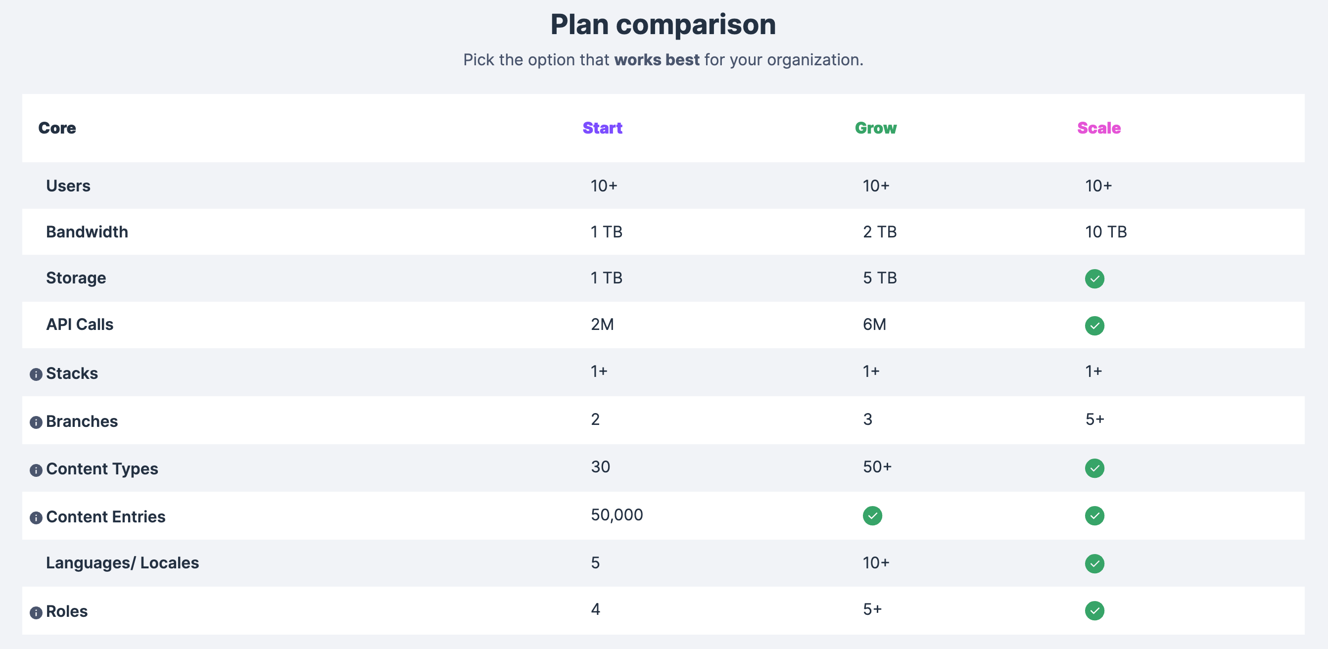 Now if your pockets are a bit deep and your needs great then you may be looking at the Grow or Scale plans. Even from just looking at the preview of features you can tell that all your business requirements will be met. Unlimited stacks, content types, locales, entries & assets and roles? Take it from someone who has experience dealing with CMS limits, this is pure gold.