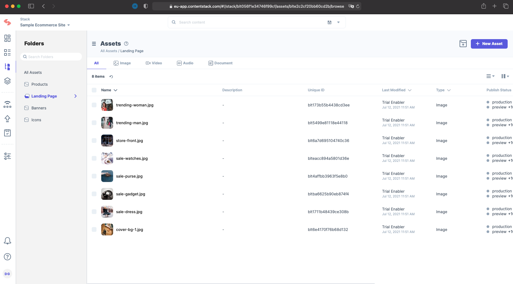 The Assets section can be organised and filtered by folders and Contentstack accepts all major asset types including images, video, audio and documents.