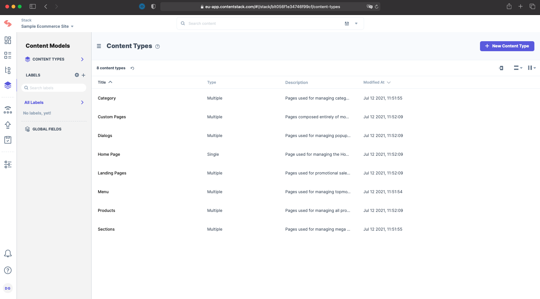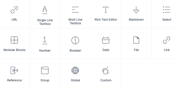 Developers will use content types to structure your content in the Content Models section. Content types are fully customizable and can be anything from a page template to a navigation link. The types of fields that can be added to a content type include: