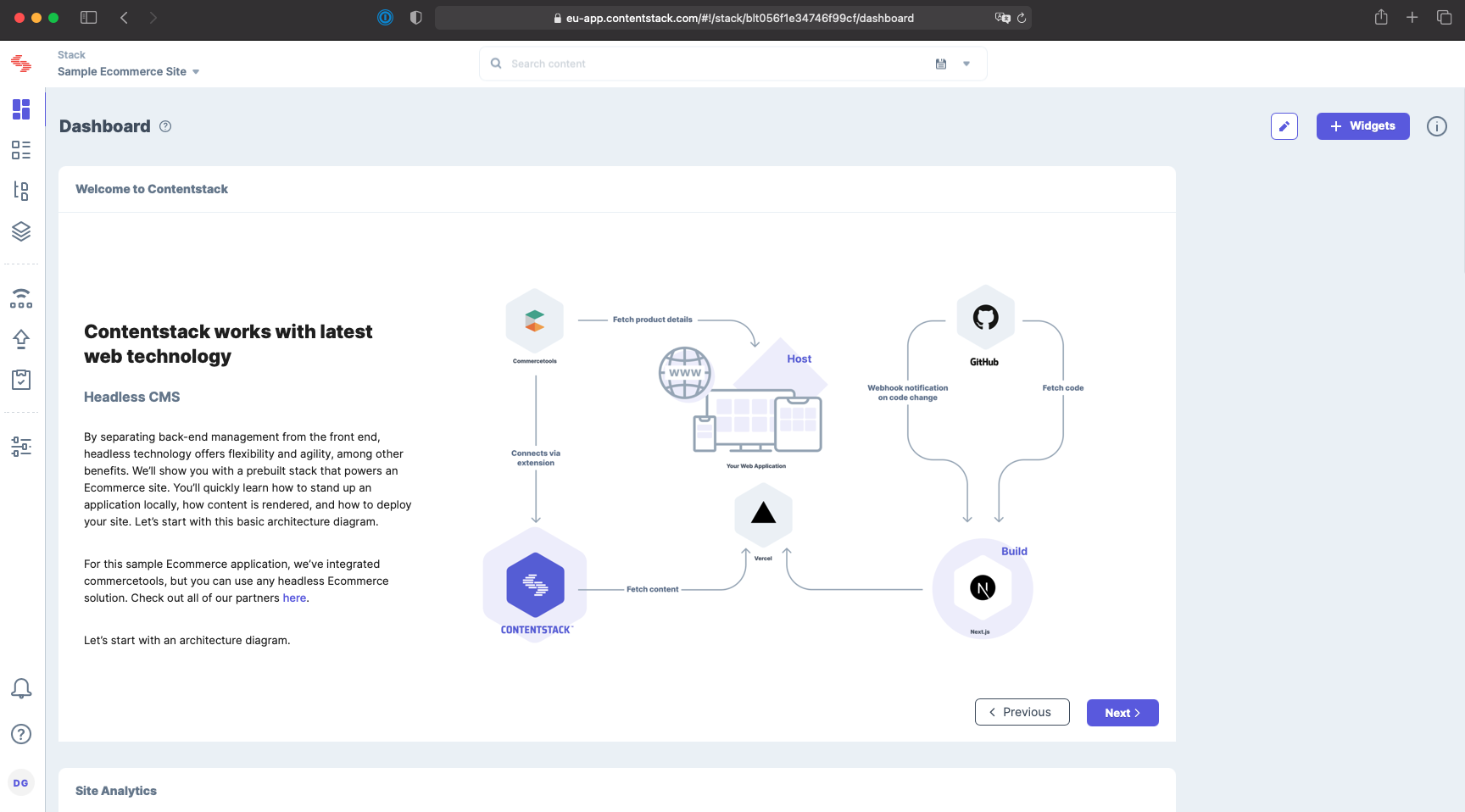 The first thing you’re going to do is create a new Stack which is a container for everything you need to create and manage your content and workflow. Upon entering your stack you will be presented with a dashboard. There are a couple default widgets with tips and links to documentation, but you can also implement your own custom widgets to display useful content by integrating 3rd-party services like analytics.
