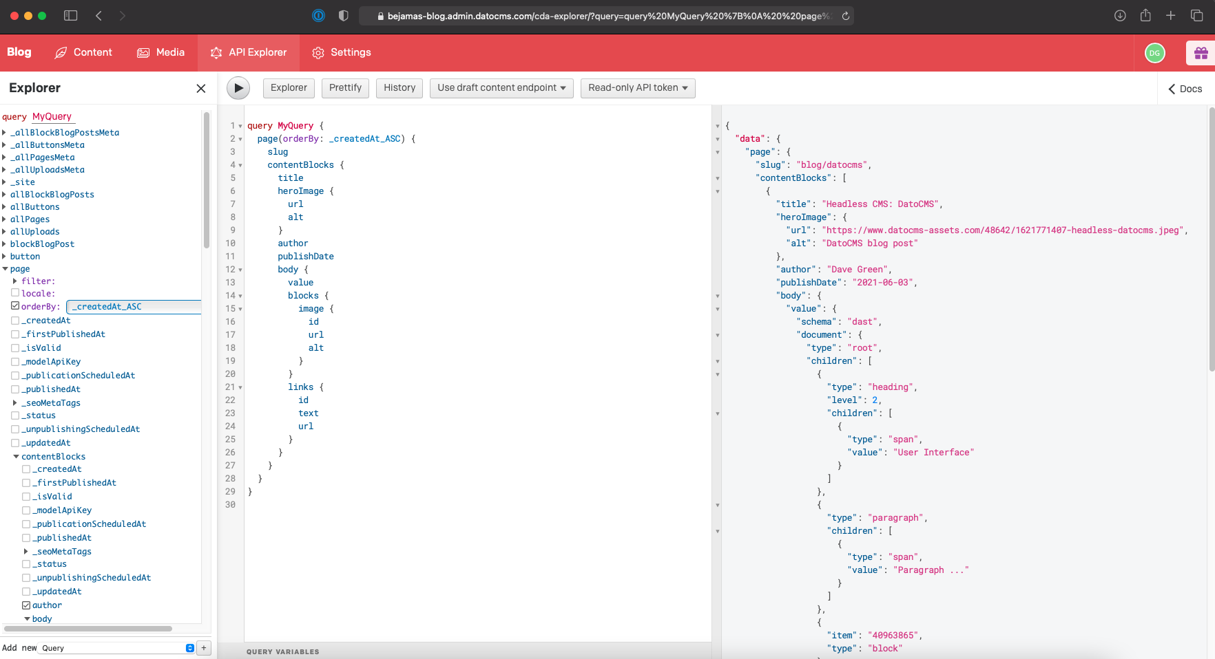 The above image shows an example of the API Explorer, a GraphiQL playground right in the CMS! No more waiting for your local build to finish before gaining access to all your data. Personally, a huge timesaver for me especially when I just want to quickly check something.