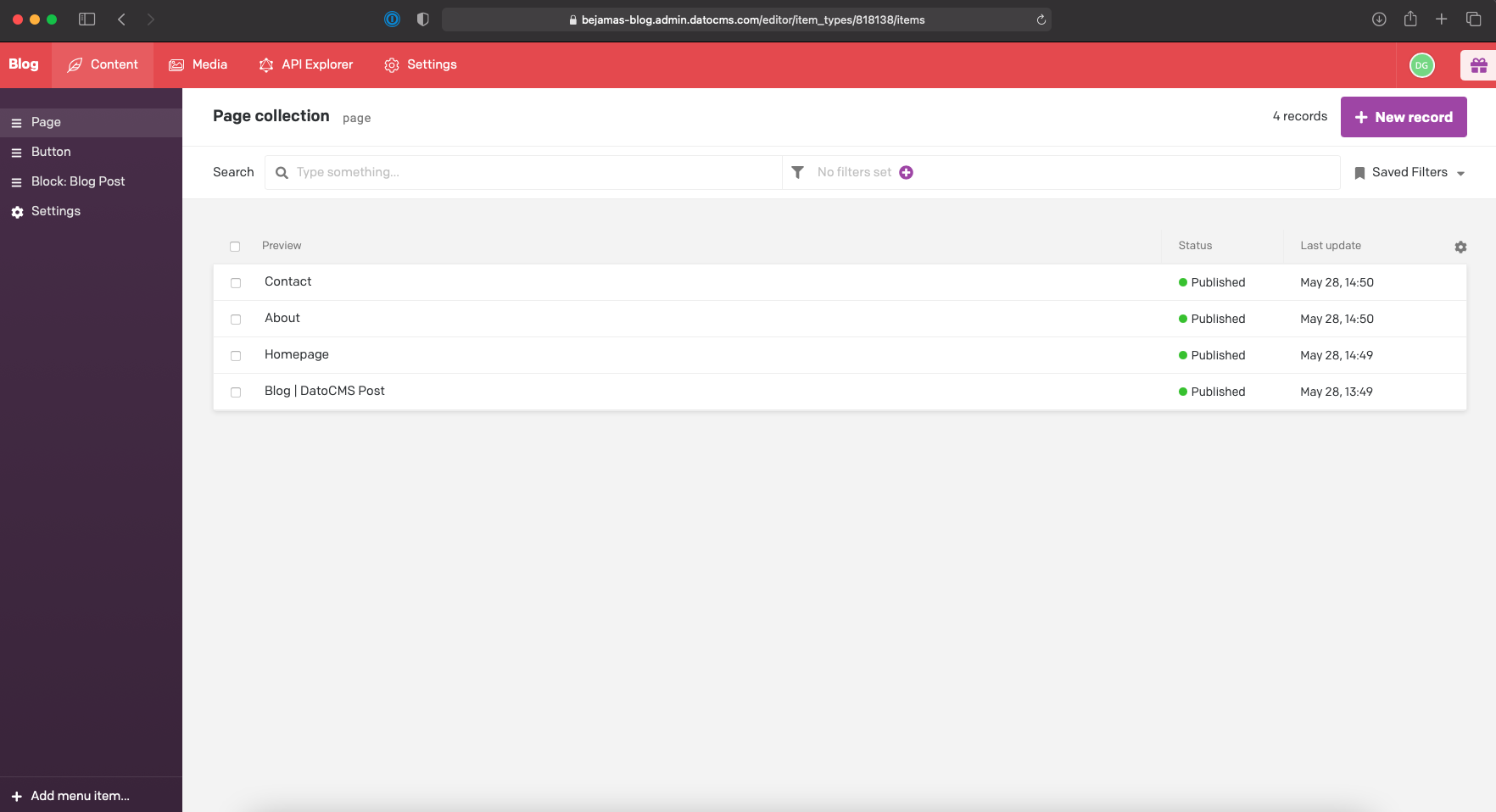 Once you’ve created some content you will be able to see all available models in the left-hand side menu of the content page. To improve manageability, DatoCMS lets you create new menu items that can be used to group your models. Plus, the UI is very clean making it easy to filter and search for content as you continue to scale up.
