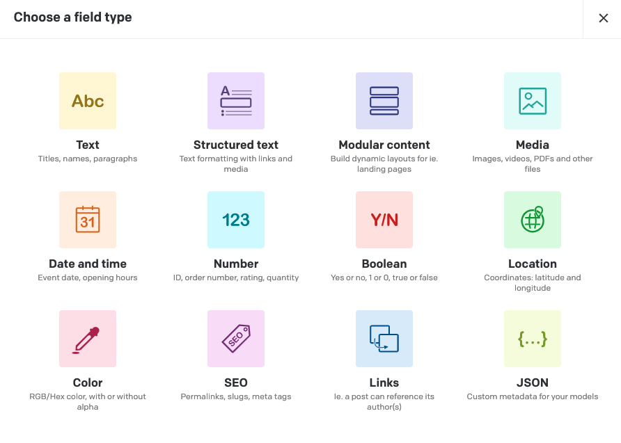 Models are your content types. They contain all the fields you need to create a content entry such as a page or blog post. The Enterprise plan allows for a custom amount, but all other plans get 60 models. There are many different fields to choose from:
