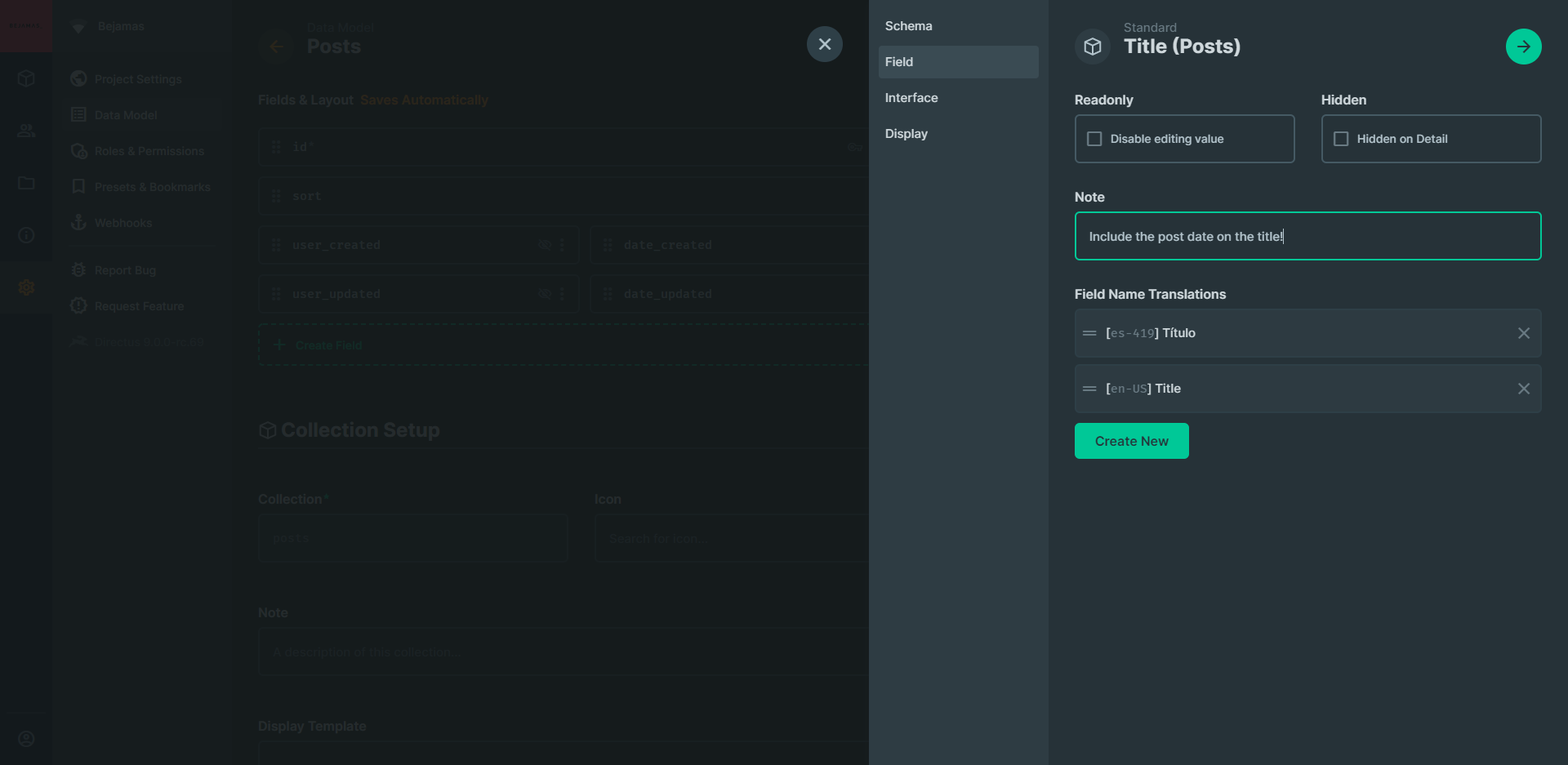 Here is where Directus gets awesome, after setting the field’s Schema we begin to set the Field in the interface, we can set if it’s Readonly if it’s hidden, add a Note and add a Field Name Translations we can use this instead of the field name in the database.