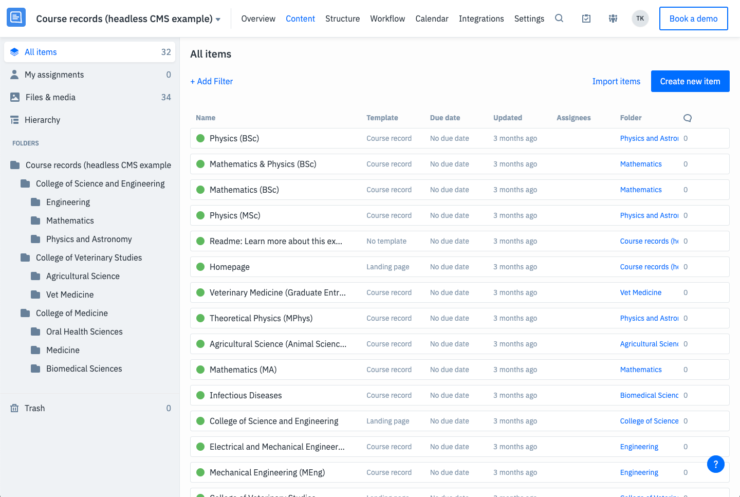 GatherContent's Content dashboard looks similar to an OS file browsing app. On the left is a sidebar with Folders and Subfolders. And on the right is a list of all items.
