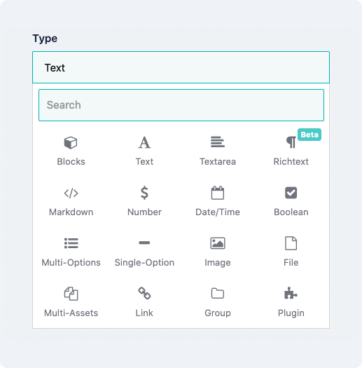 Besides the standard ones, like Text, Number, Image, or Assets, there are a couple of non-standard ones, like Plugin. In Storyblok you can use custom fields, which basically allows you to use more robust fields like "color-picker", "vimeo", "fontawesome icon selector" that are created by the Storyblok team, in your own plugin built for a specific use case (I'll cover that later).