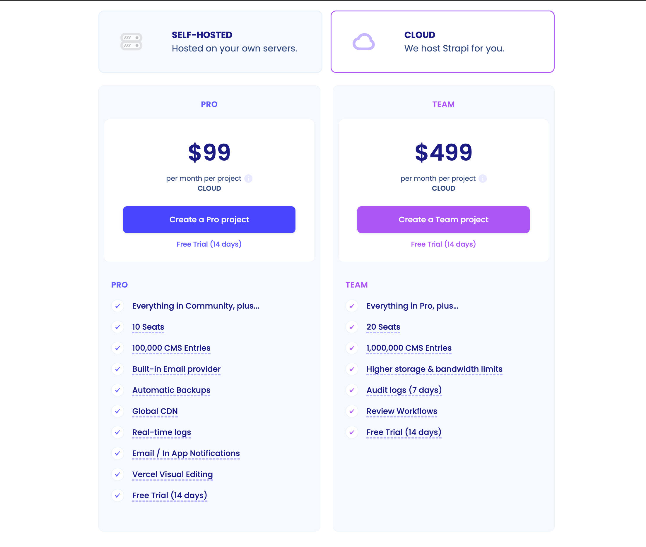 If the thought of handling it on your own makes your head explode 🤯, don't worry. They offer a cloud version where they host Strapi for you, which is great because you will be able to forget all about the server things and focus only on your product, and you will get some features like unlimited environments and usage.