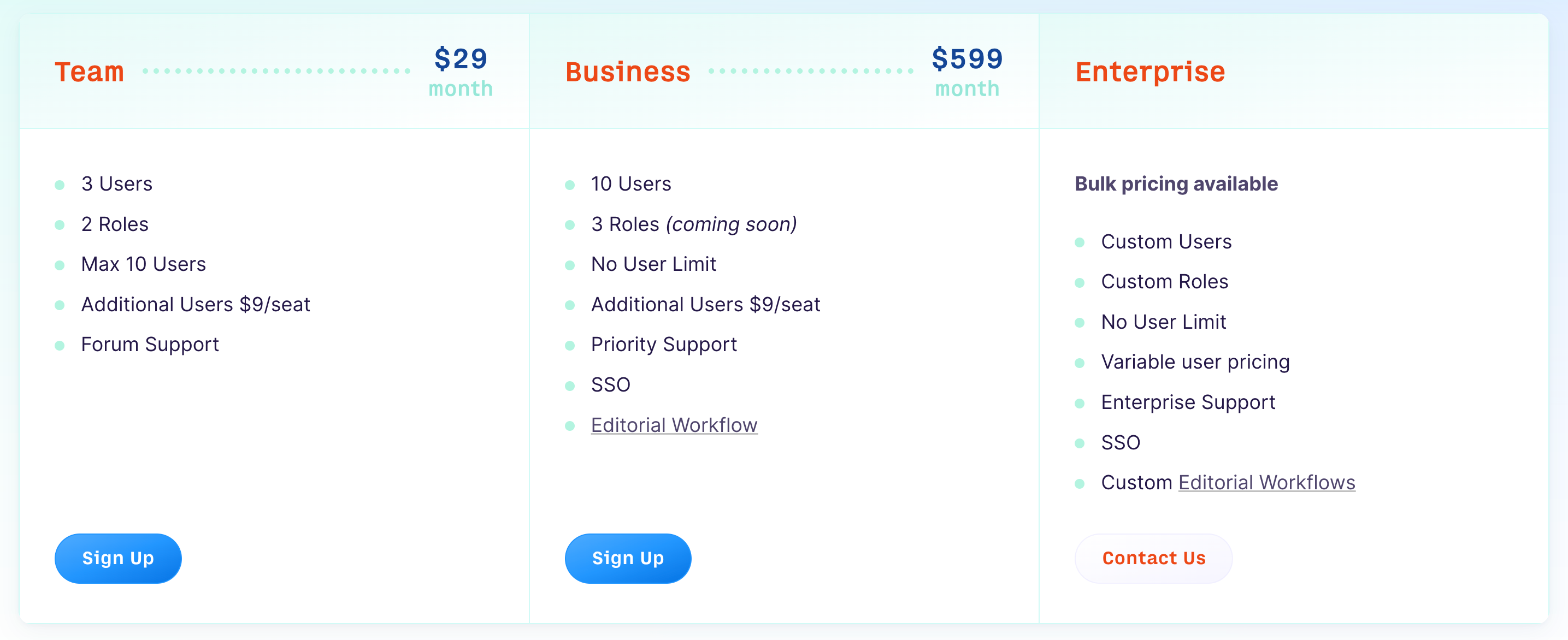 Business: Geared towards businesses, the Business plan is available at $599 per month. It includes 10 users, 3 roles (coming soon), and no user limit. Additional users can be added at $9 per seat. This plan provides priority support, single sign-on (SSO), and an editorial workflow for enhanced content management.