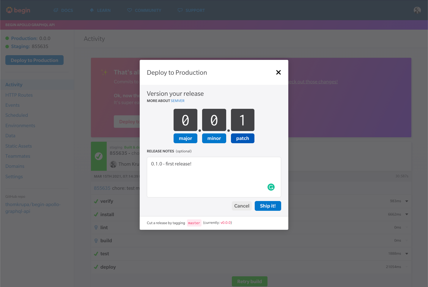 If you click the "Deploy to Production" button, you will see a popup with an optional field for release notes. It's cool, but if you already use Github releases or Pull Requests, that might be a bit odd and unnecessary step for you.