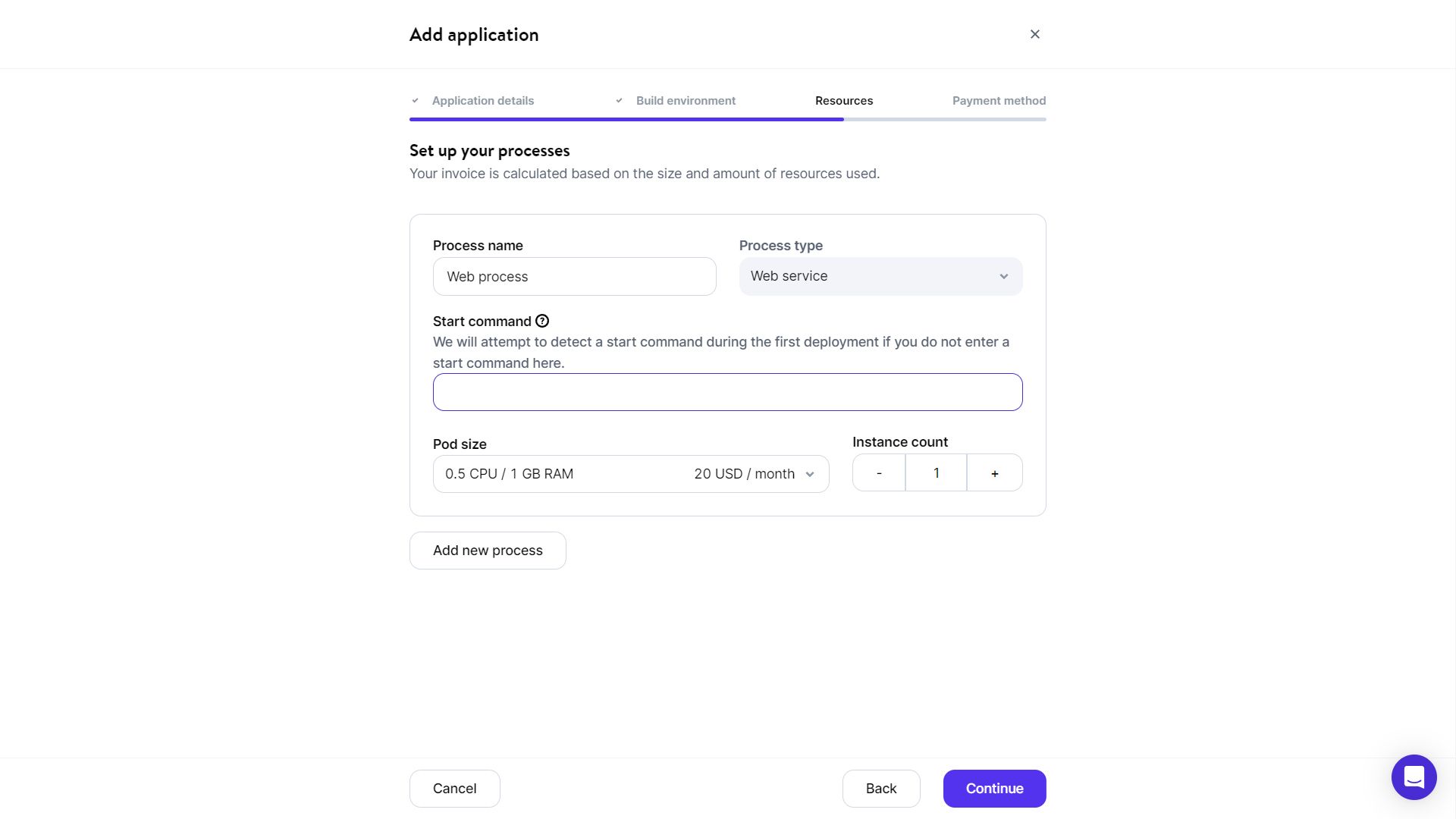 The next step allows you to set the resources for your processes. Also, you have the option to configure the start command. For most projects, you can leave it empty: