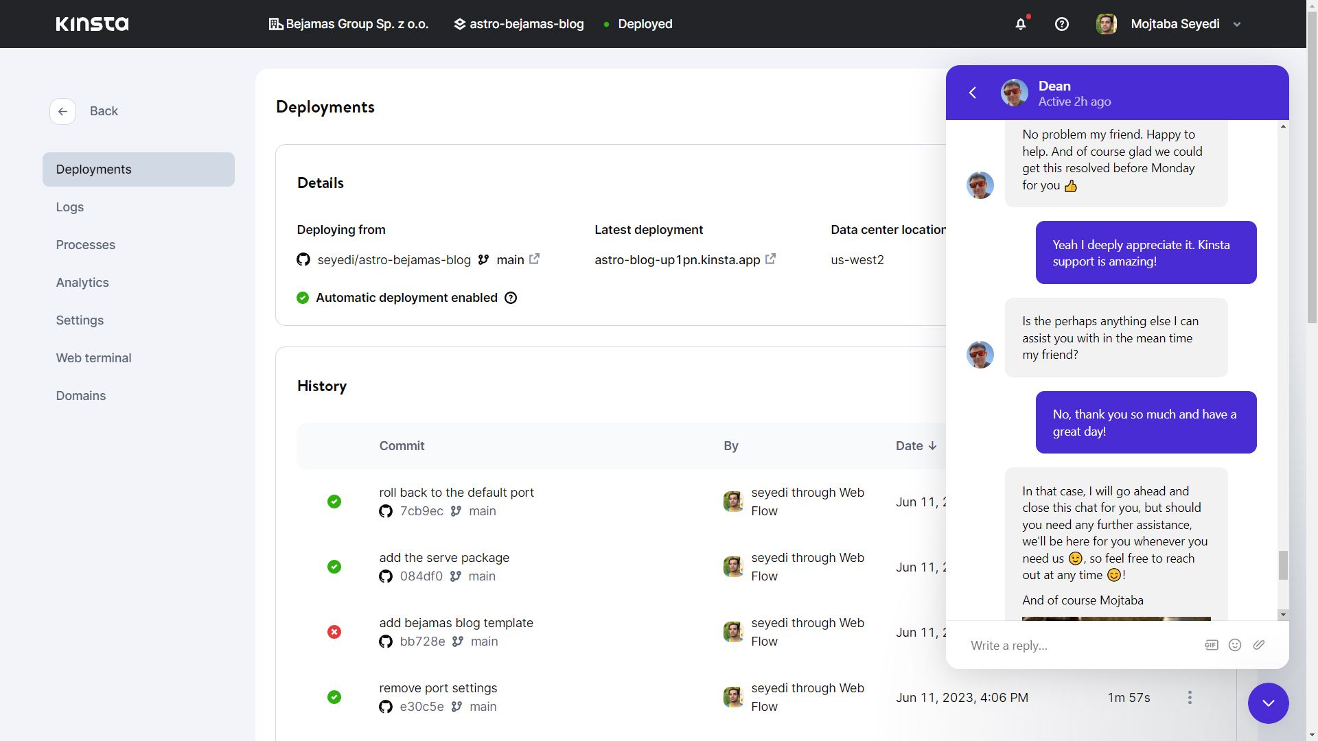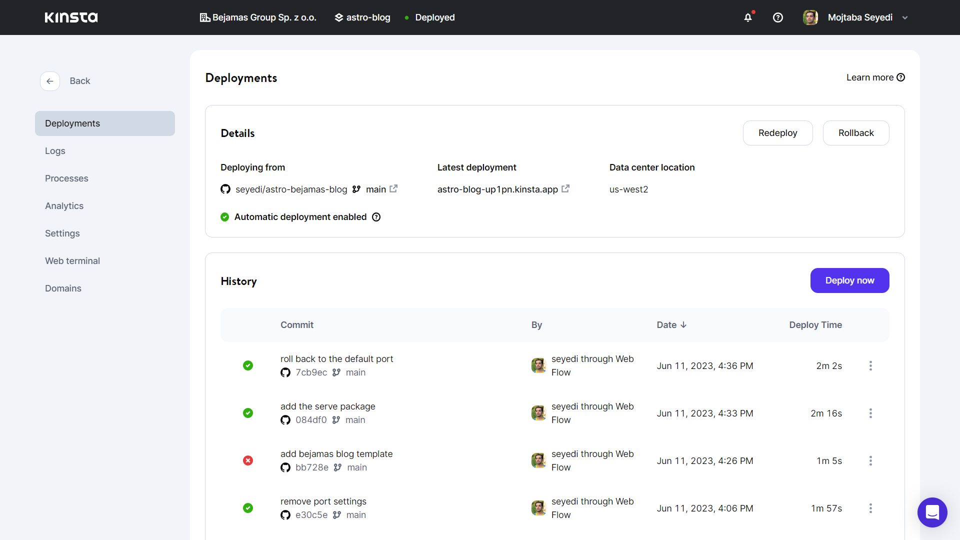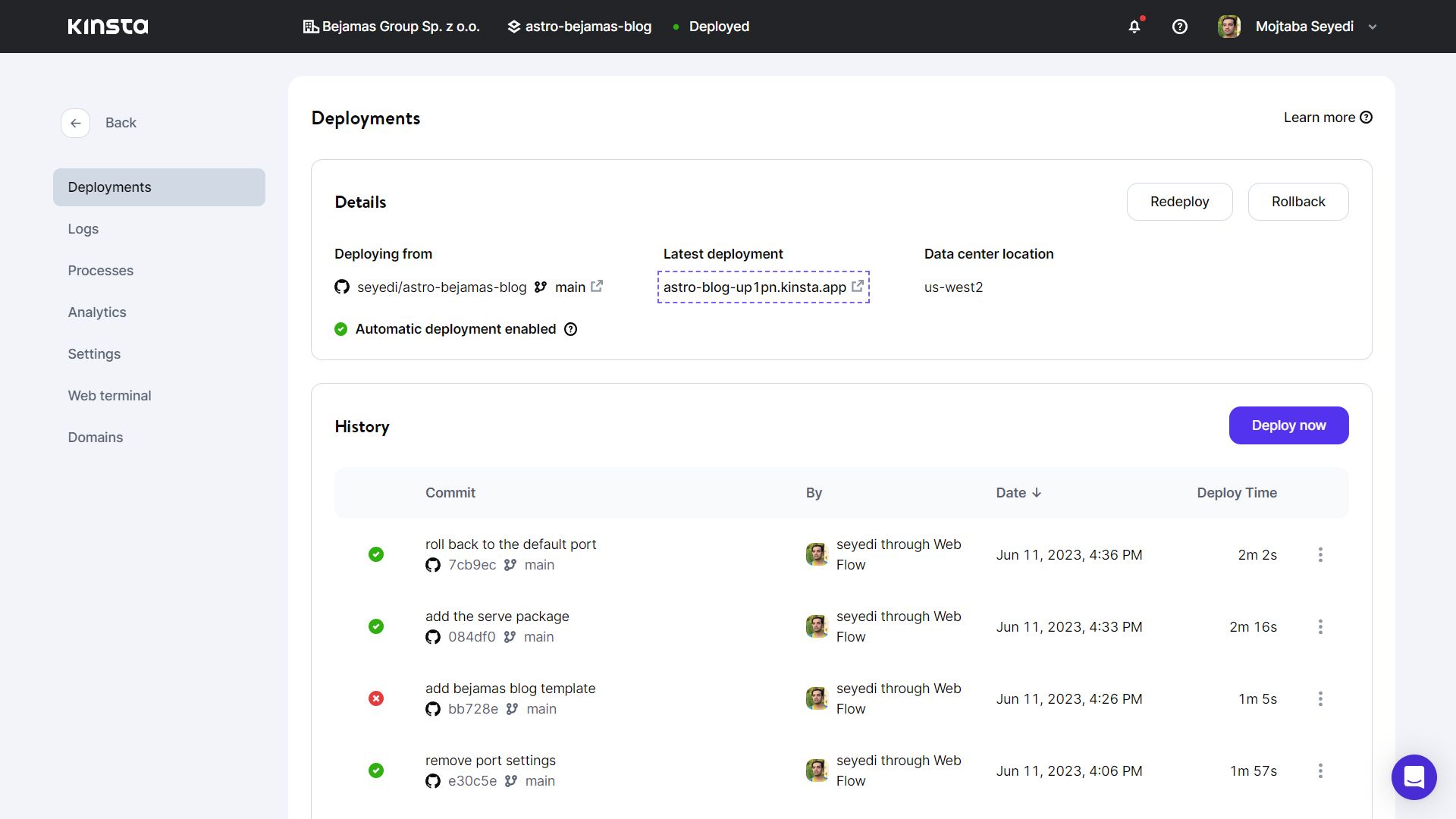 Finally, you can deploy your project either manually or automatically upon committing changes. Once deployed, you can easily access your website by using the link provided by Kinsta.