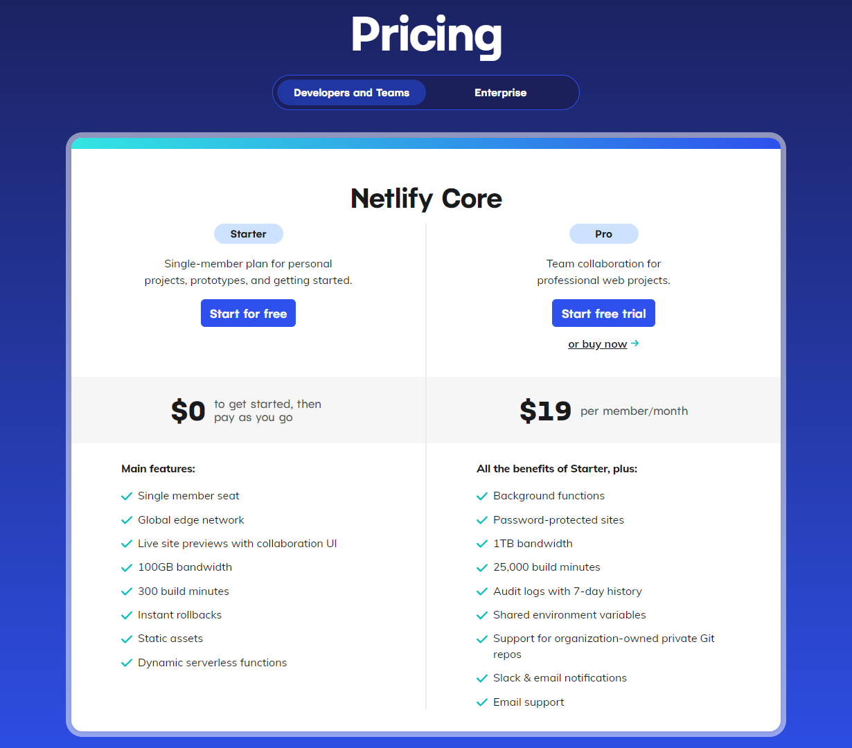 From a developer's standpoint, Netlify offers a comprehensive set of features and a user-friendly interface that simplifies the web development process. The platform is dynamically developing following all the main trends in Jamstack ecosystem. The starter Pro tier should be good enough for small and medium teams that don't expect traffic spikes and just need easy-to-use, reliable, and scalable hosting for their static websites.