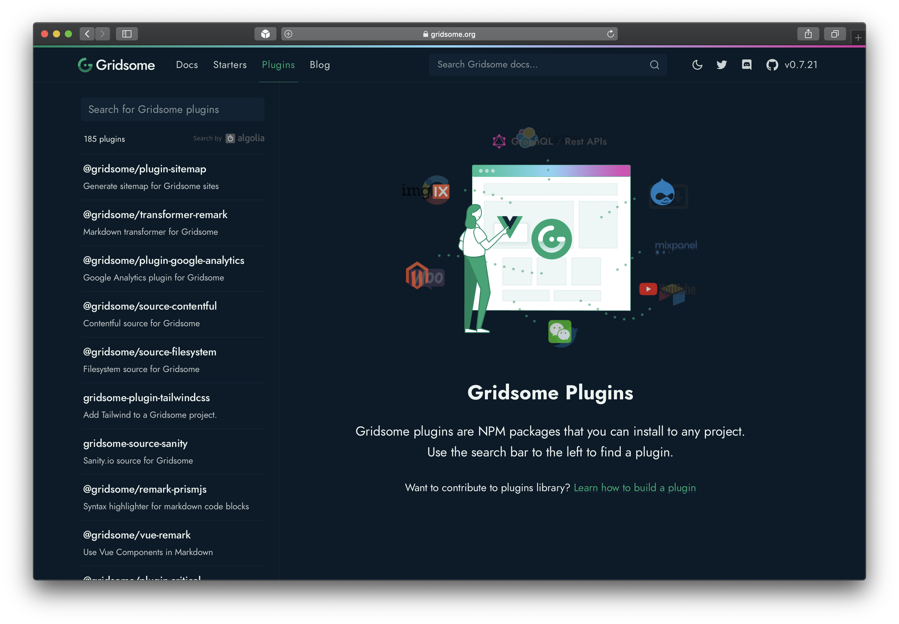Gridsome’s collection of plugins doesn’t come anywhere close to that of Gatsby’s, but there are a number of useful ones that can help you connect to a popular CMS of your choice, set up Google Analytics and generate a sitemap for example.