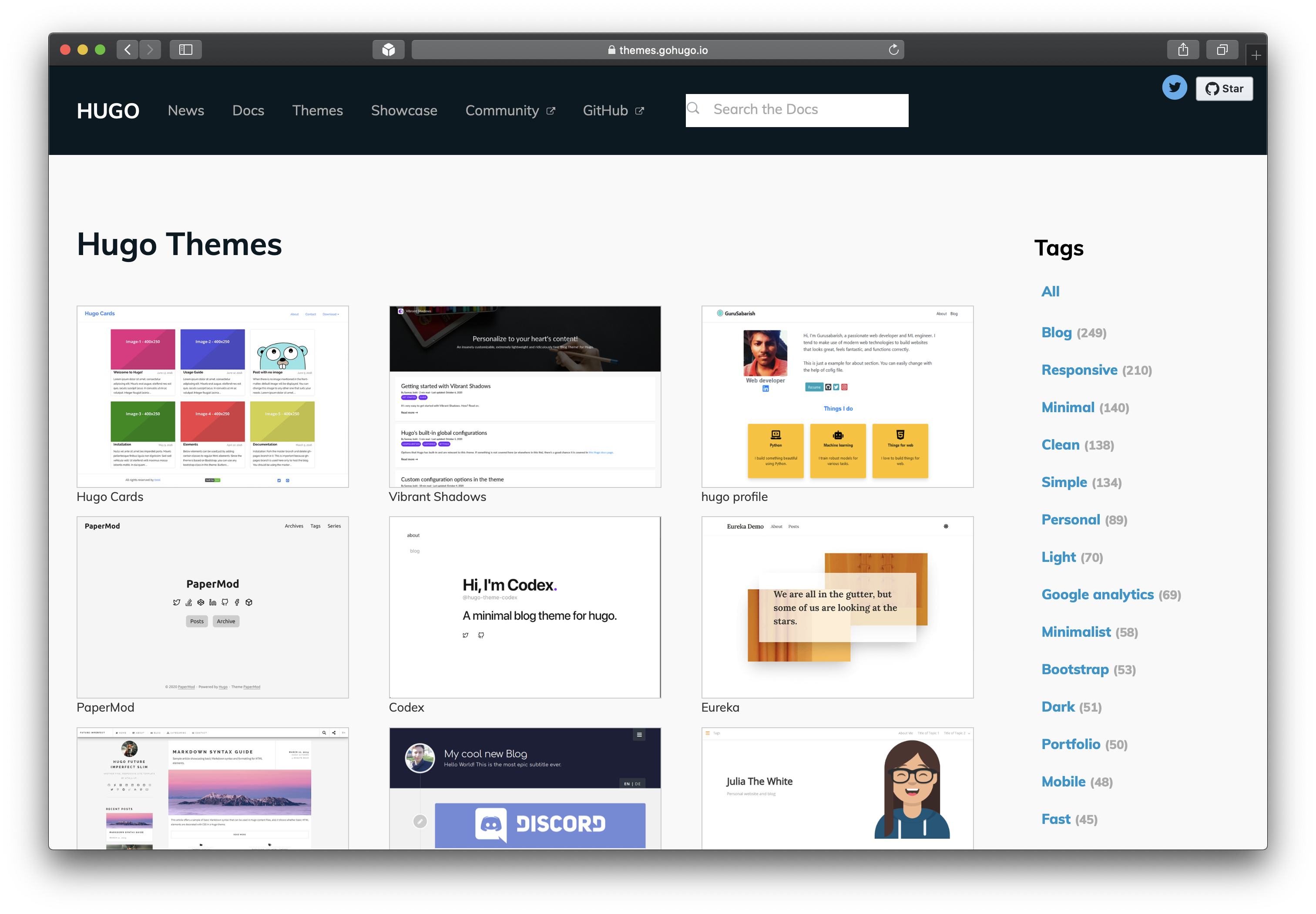 Hugo maintains a large collection of themes. Those are not official projects. Most of them are created by Hugo developers from all over the world. Offered on MIT license - free to use and modify. There is a variety of categories to explore: simple blogs, documentation, landing pages, resume, and many more.