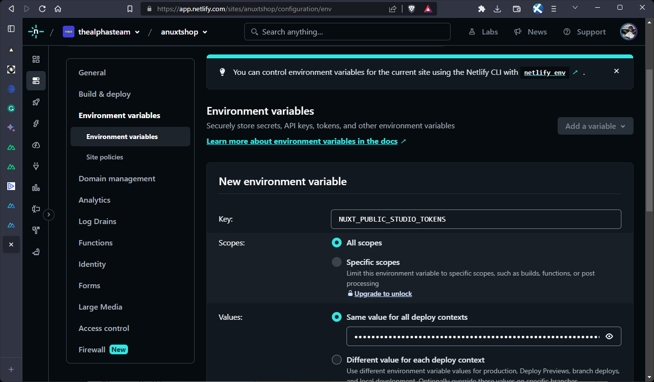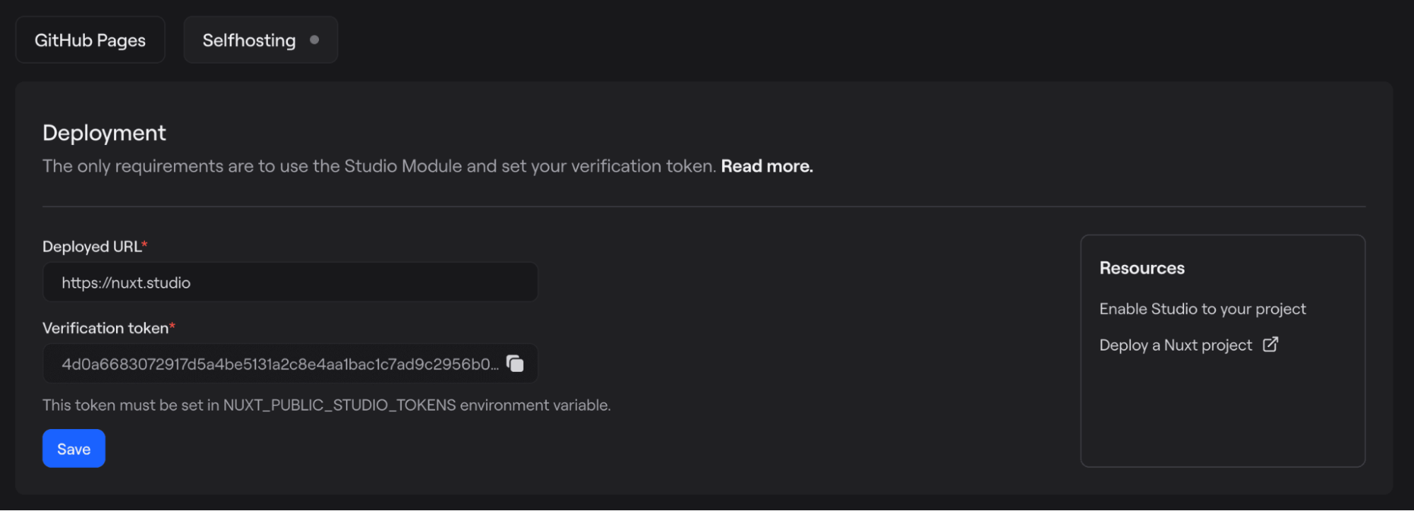 To set the verification token, we need to define the NUXT_PUBLIC_STUDIO_TOKENS environment variable and assign it your verification token.