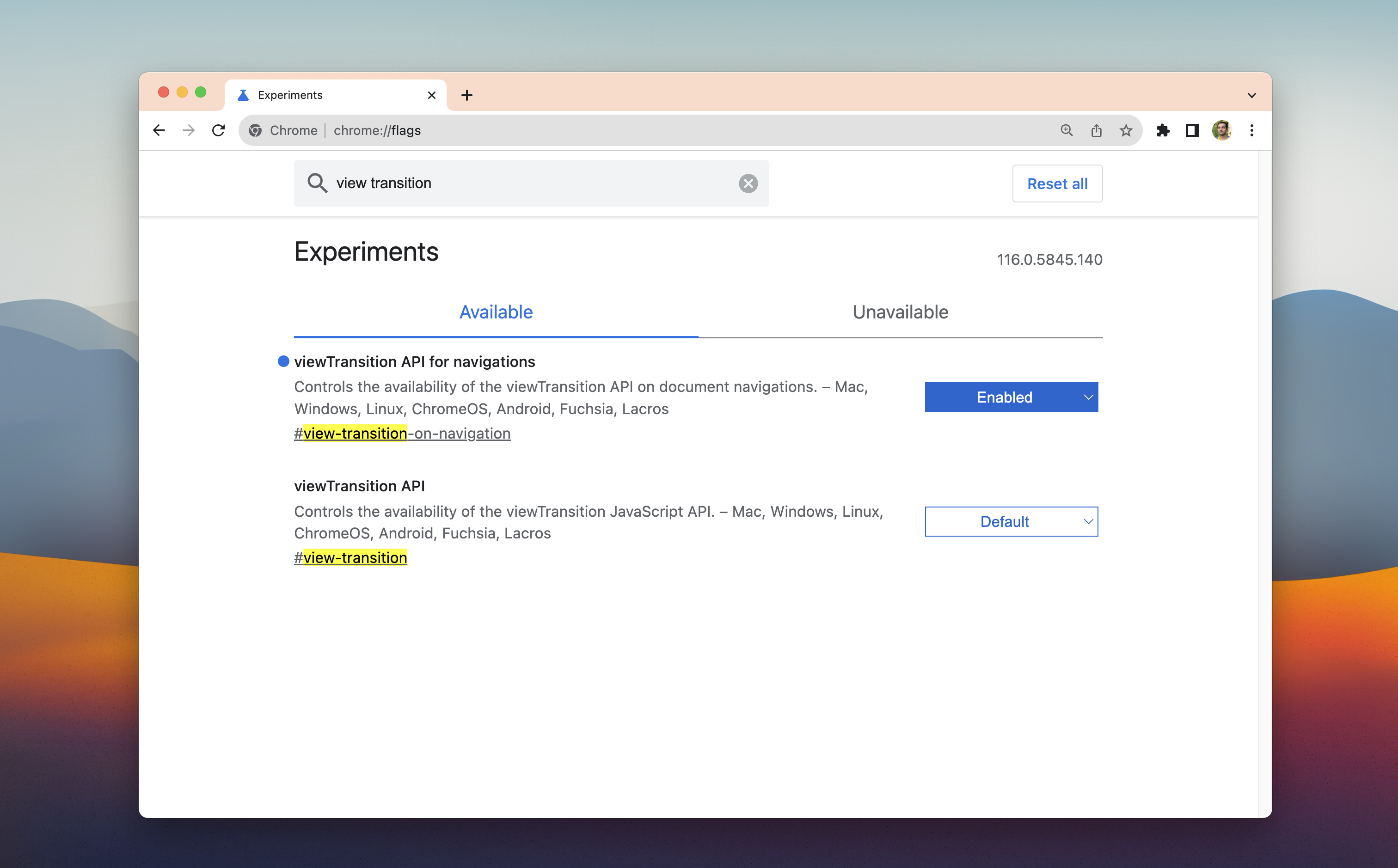 Type chrome://flags in your browser's address bar, find the viewTransition API for navigations and change it to Enabled.