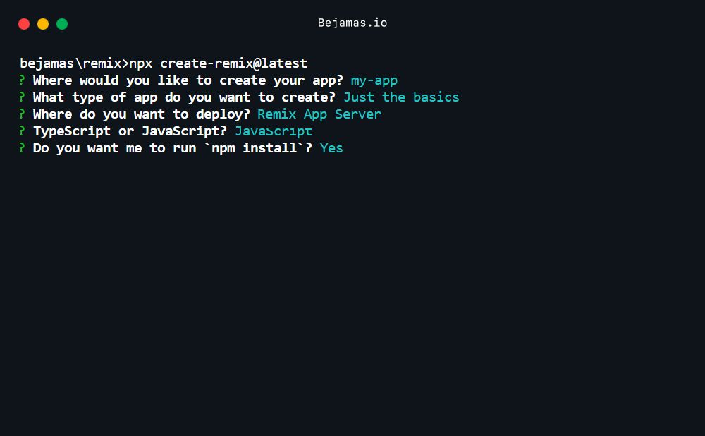npx create-remix@latestThis will prompt you to answer a few questions: